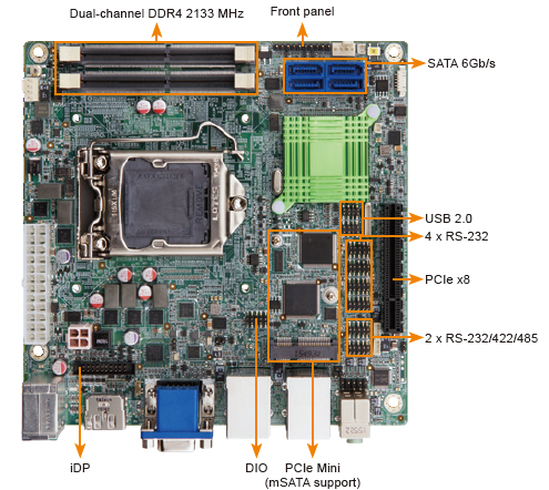 | ● Mini ITX form factor with LGA 1151 Intel® 6th/7th generation Core™ i7/i5/i3, Pentium® or Celeron® processor and DDR4 2133MHz memory support |