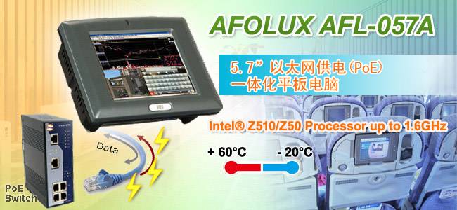 AFL-057A 是一台以太网供电(PoE)的一体化平板电脑。它使用超低功耗 Intel® Atom Z510/Z530 处理器,以及一个5.7寸的 LED 背光液晶面板。AFL-057A 具有PoE功能,外形紧凑,无风扇设计,很容易部署在建筑中作为家庭自动化系统,楼宇控制系统等安全应用。 |