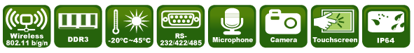 10.2" 400cd/m² WSVGA fanless panel PC with Intel® Atom™ cedarview N2800 dual core 1.86GHz, 802.11b/g/n wireless module, resistive touch screen, 2M camera, microphone, 2GB DDR3 RAM, R10 | |